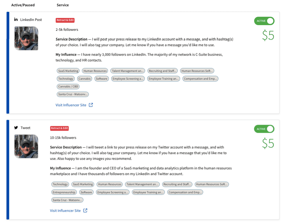 Example: Here are the two services I’m offering in the Newsworthy.ai influencer marketplace. Note: I intentionally price my services low in order to network and meet new people/companies. And I enjoy sharing news from start-ups and interesting companies — takes me a few minutes:
