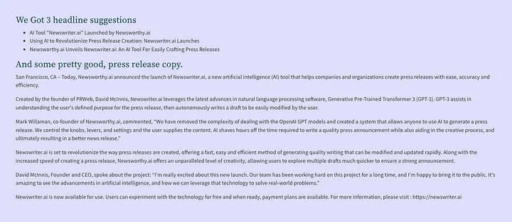 Let’s look at an example using Newsworthy.ai's AI press release writing tool, NewswriterAI — the first GPT-3 OpenAI powered generative AI press release writing tool introduced in February 2023.